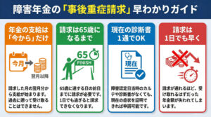 障害年金の申請手続きを考える際によく出てくるのが「障害認定日」という言葉です。 これは、障害年金を受け取るうえで非常に重要な節目となる日です。 本記事では、障害認定日とは具体的に何を指すのか、その決まり方(原則と例外)、 […]