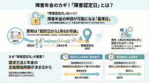 原則として、初診日から1年6か月が経過した日(またはその前に症状が固定した日)と、20歳に達した日の前日を比べて遅い方の日が「障害認定日」になります。