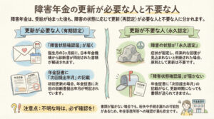 • 更新が不要になり得る人:障害の状態が「永久固定」と認められ、再認定が原則不要とされる場合(実務上は“永久認定”と呼ばれることがあります)