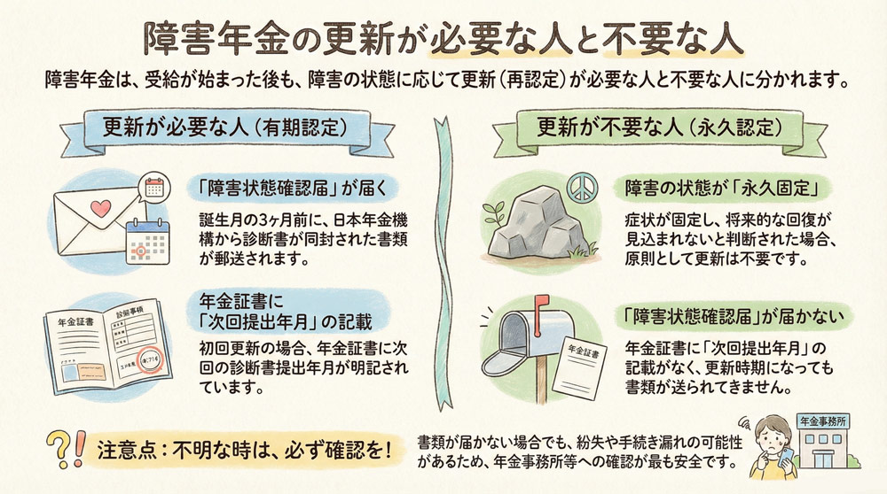 障害年金の更新(再認定)が必要かどうかは、あなたの障害の状態に応じて「提出が必要となる年」に、日本年金機構から「障害状態確認届(診断書)」が送付されるかで判断するのがいちばん確実です。