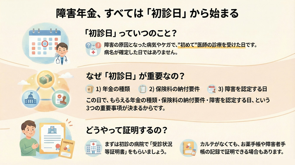 以上のように、初診日は「どの年金が受け取れるか」「保険料要件を満たすか」「いつ障害状態を認定するか」という重要事項に直結します。