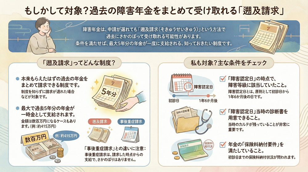 遡及請求とは、簡単に言えば「本来もらえたはずの障害年金を、後になってまとめて請求する方法」です。(日本年金機構ホームページ:障害基礎年金の受給要件・請求時期・年金額)