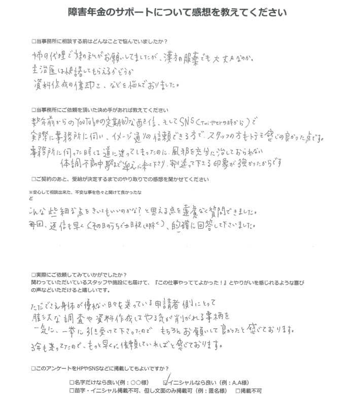 障害年金のサポートについて感想を教えてください。