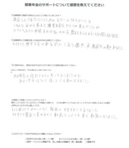 それでいて、とても、親切で、何もわからない私に対して、不安な事を、言うと、丁寧に対応していただき、とても、たすかりました。お陰様で、障害年金2級を、頂く事が出来、気持ちが、楽に、なりました。本当に、ありがとうございました。