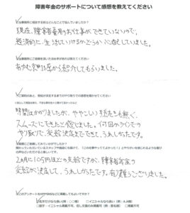 おかげさまで障害年金を受給することができ、心から感謝しています。