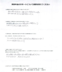 それでいて、とても、親切で、何もわからない私に対して、不安な事を、言うと、丁寧に対応していただき、とても、たすかりました。お陰様で、障害年金2級を、頂く事が出来、気持ちが、楽に、なりました。本当に、ありがとうございました。