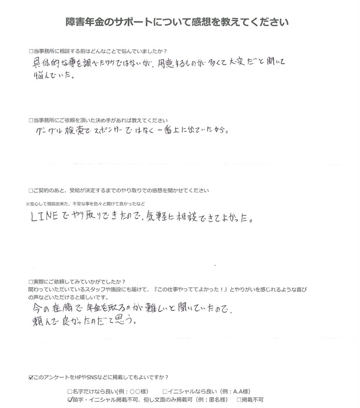 障害年金のサポートについて感想を教えてください。