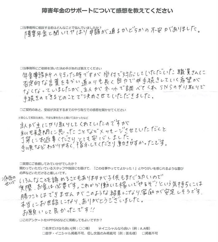障害年金のサポートについて感想を教えてください。
