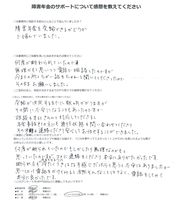 受給が決定するまでに数ヶ月かかりますが、その間に不安になることもあったのですが、相談をするときちんと対応してくださるし、年金事務所の方にも進行状態を問い合わせてくださり、その結果を連絡くださり、安心してお任せすることができました。