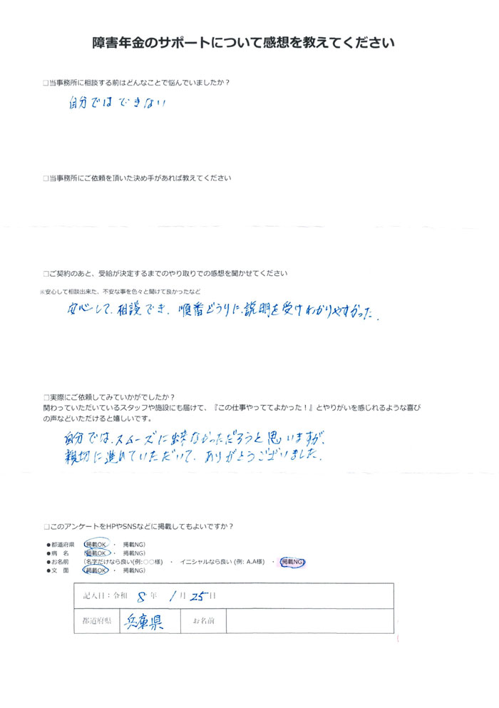 障害年金のサポートについて感想を教えてください。