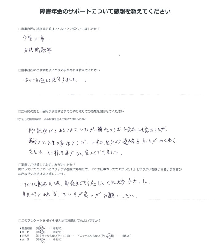 障害年金のサポートについて感想を教えてください。