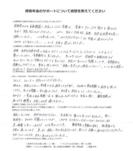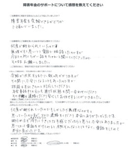 O.H 様(2026年1月19日)からのご感想 ご記入日 2026年1月19日 ご依頼者 O.H 様 都道府県 大阪府 傷病名 網膜色素変性症 障害年金のサポートについて感想を教えてください。 当事務所に相 […]