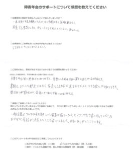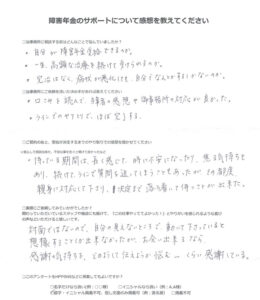坂根 様(2025年11月20日)からのご感想 障害年金のサポートについて感想を教えてください。 当事務所に相談する前はどんなことで悩んでいましたか? 年金が通るのか、就職できるか、そういう悩みがありました […]