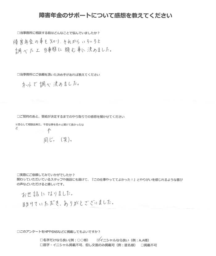 【障害年金申請者様の声】匿名 様(2024年9月15日)